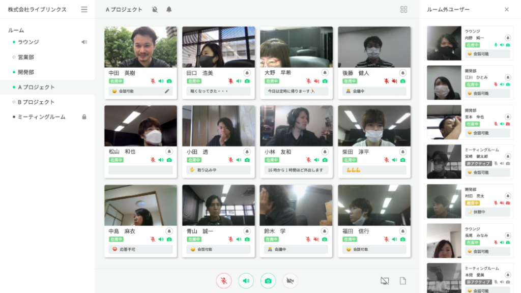 仮想オフィスツールでは、現在会話ができるのか、それとも会議中や外出中なのかのステータスを表示する機能があります。これにより、今話しかけていいのかが事前に判別ができます。