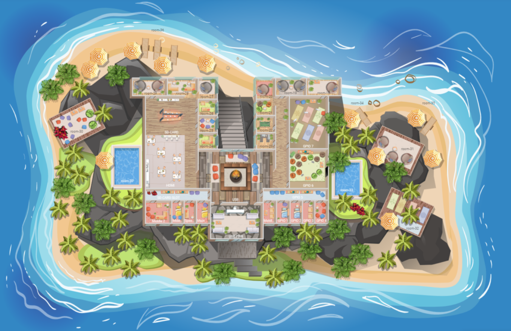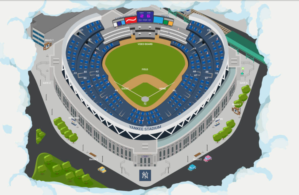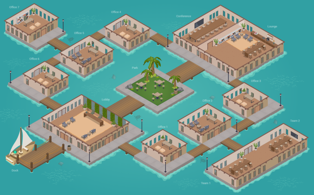 なんと300を超えるオフィスレイアウトがあり、中には南の島や球場、銀行、宇宙船なども。楽しい仮想オフィス空間を構築できます。