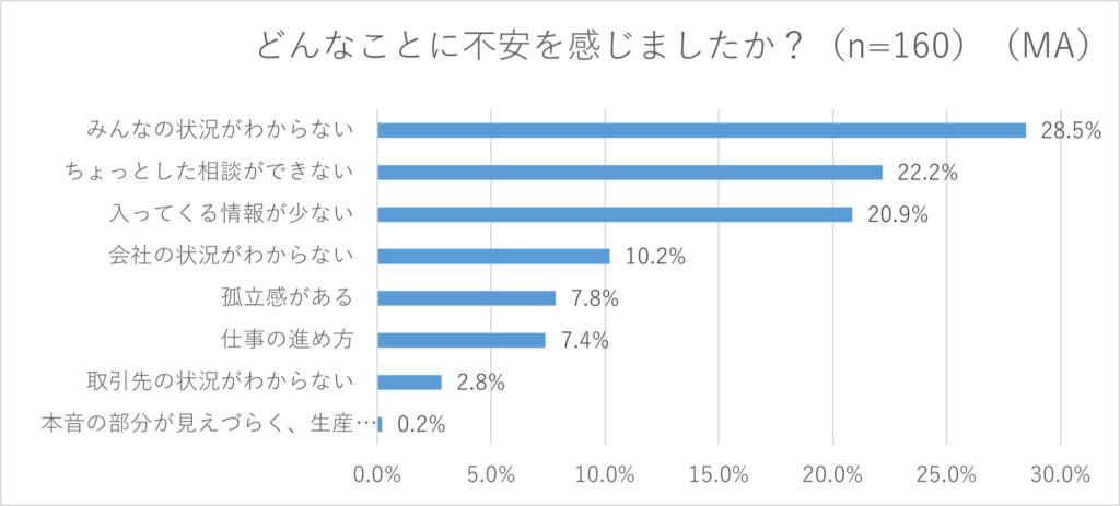 不安に感じた内容としては、「みんなの状況がわからない」「ちょっとした相談ができない」「入ってくる情報が少ない」などが上位にランクインしています。